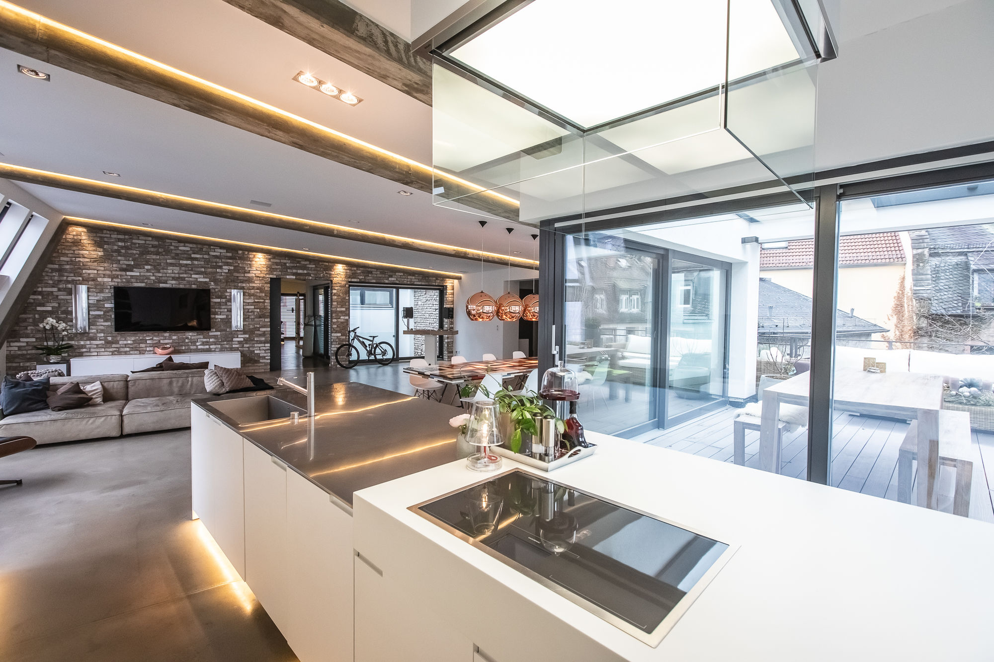 „Niemand, der mich draußen kennt, würde denken, dass ich so wohne“, sagt der erfolgreiche Unternehmer. Sein Tattoo gleicht dem Brustschild eines Kämpfers. Raue Schale. Einer, der sich nicht die Butter vom Brot nehmen lässt. Seine Partnerin lebt die Stärke ohne Rüstung. Beide tun viel für ihren Körper, was eine eindrucksvolle Kraftstation zwischen Badewanne und Bett demonstriert. Vis-à-vis geht die Fitness in der kleinen Sauna und auf einer zweiten Terrasse weiter. „Den Fernseher können wir drehen, auch zur Dusche hin“, lässt das sympathische Paar seine Begeisterung für ein vernetztes Zuhause durchblicken. Praktisch alles kann hier zentral oder über das Handy gesteuert werden, natürlich auch die Wärme der Fußbodenheizung und der steinernen Handtuchablage, welche die Doppelbadewanne einrahmt.