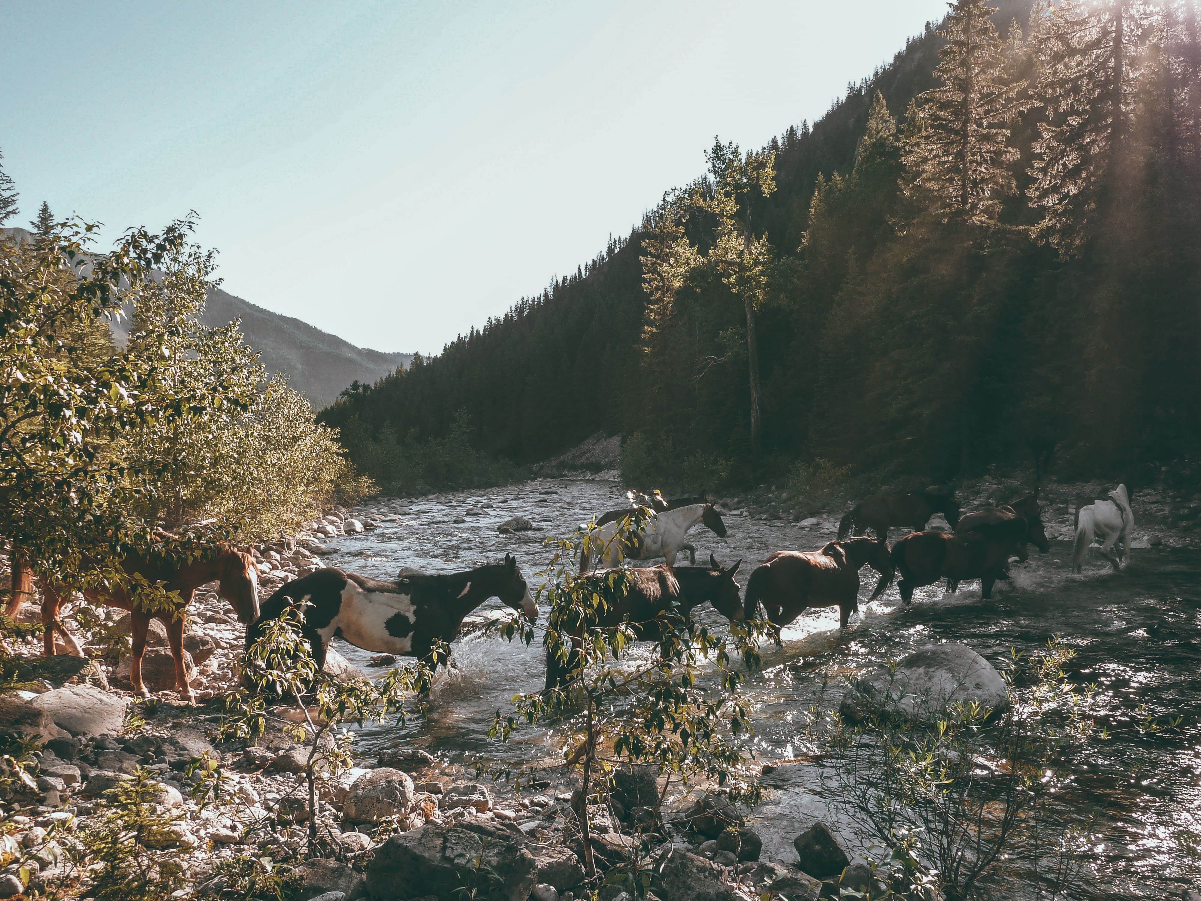 Am Abend steht uns eine selbstgebaute Dusche mitten im Wald zur Erfrischung bereit. Das Wasser wird in Plastikbeuteln erhitzt, die tagsüber auf dem Gras in der Sonne liegen. Jeden Abend ist es ein beeindruckendes Schauspiel, wenn die Pferde durch eine Wolke flimmernder Staubpartikel in den Wald davon galoppieren. Über Nacht verbleiben sie in freier Natur, ganz der Lebensweise von Wildpferden entsprechend, die heute noch in den Rocky Mountains vorkommen. Am nächsten Morgen, noch vor Sonnenaufgang, machen sich Ron und Ray erneut auf den Weg, um die Pferde zurückzuholen. Die Spuren, die sie hinterlassen haben, dienen den Wranglern als wertvolle Signale, um die einzelnen Herden in den Bergen wiederzufinden.